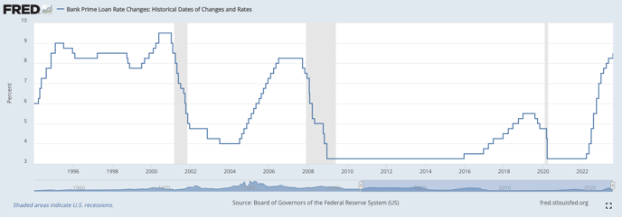 *As you can see from the St. Louis Fed chart above, the prime rate is a variable rate that changes up or down over different time periods.